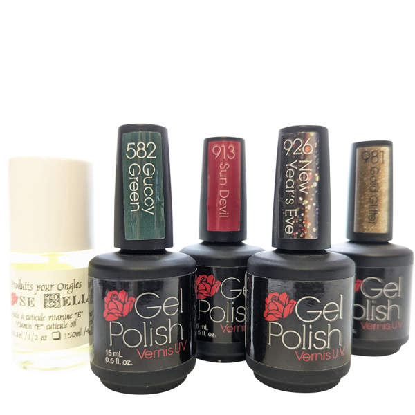 Comprends 4 couleurs et 1 huile cuticule rosebella à l'ananas 1/2 oz