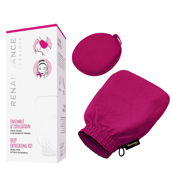 L'ensemble comprend un gant exfoliant pour le corps, ainsi qu'un gant pour le visage à deux cotés: blanc pour le nettoyage, magenta pour l'exfoliation.