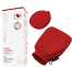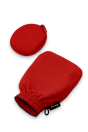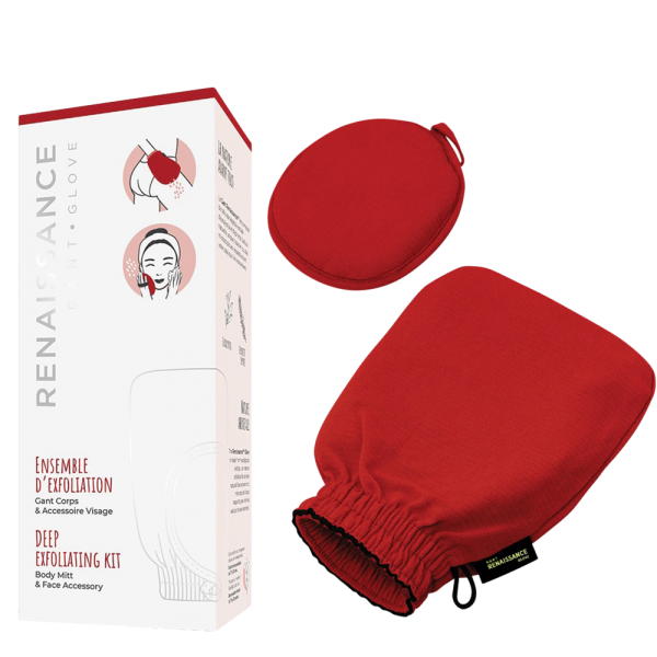 L'ensemble comprend un gant exfoliant pour le corps, ainsi qu'un gant pour le visage à deux cotés: blanc pour le nettoyage, rouge pour l'exfoliation.
